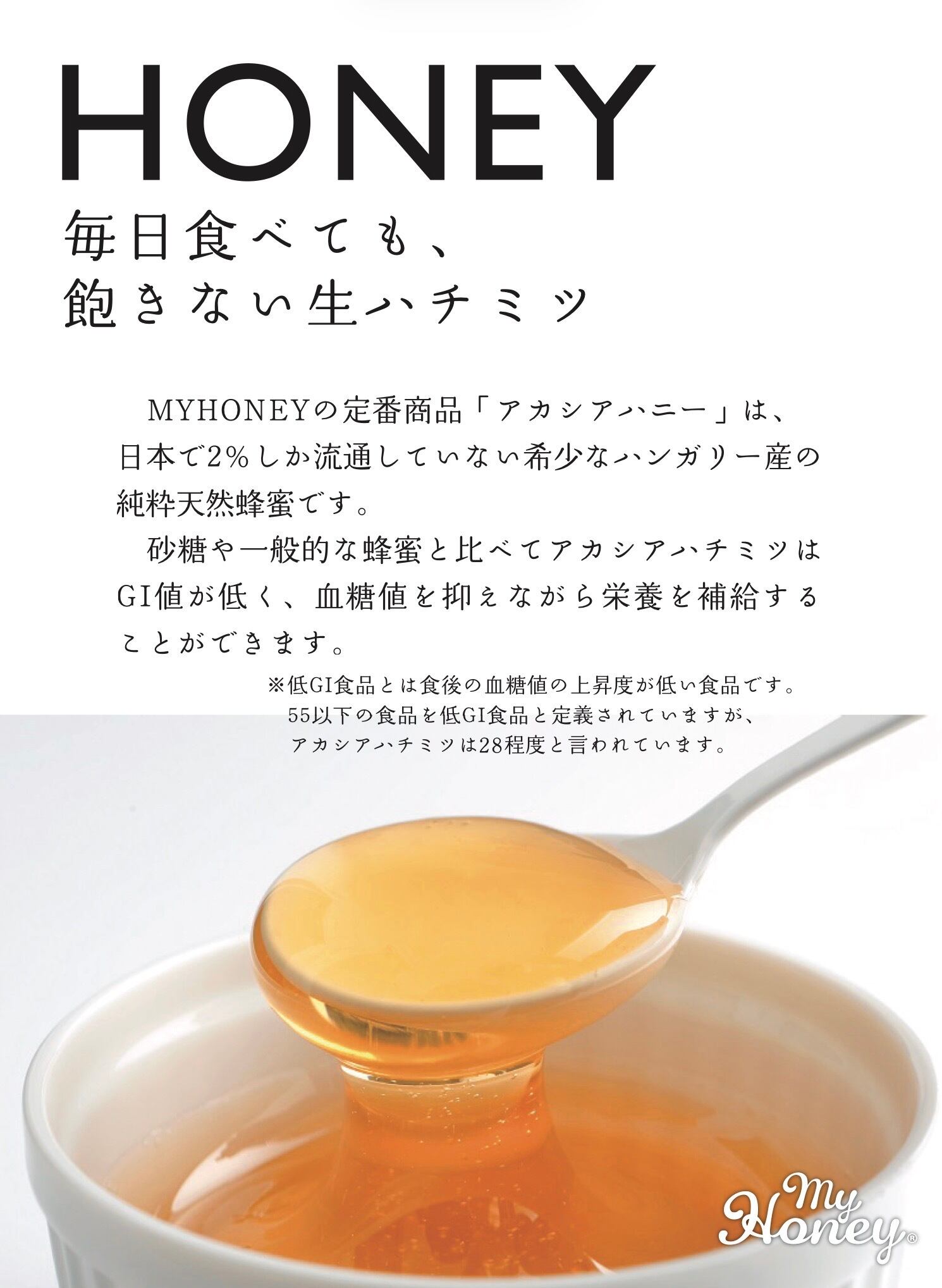 マヌカハニーに負けない抗菌・抗酸化力!マヌカハニーよりも低GI・低価格のアカシアハニーで「はちみつ習慣」を! 日本にわずか2%しか流通していない稀少なハンガリー産のアカシアはちみつです。「毎日続けられる、飽きないはちみつ」を目指しました。 「これなら毎日食べられる」「はちみつ生活をはじめて体の調子が良くなった」との嬉しいご報告をいただいております。 【日本で初めての認証】 マイハニーは、ハンガリー大使館から日本で初めて認証を受けました。私たちが「美味しい」はもちろん「安心」にも心を込めて取り組んでいる証のひとつです。 徹底した温度管理により、はちみつが本来持つ190種類を超える酵素を、損なうことなく皆様にお届けしています。 世界中から選りすぐったハンガリー産の非加熱・生はちみつ。そのGI値はなんと28!豆腐や大豆、パセリよりも低い数値。 低GI食品なので、糖尿病を予防するために血糖値をコントロールしたい方や、ダイエットを意識している方におすすめです。お料理の際は、「砂糖大さじ1=はちみつ小さじ1」で置き換えてください。 おうちごはんにもプレゼントにも最適です。 ◇賞味期限:製造日より2年 ◇栄養成分:(100gあたり)エネルギー:332kcal、たんぱく質:0.3g、脂質:0g、炭水化物:82.7g、食塩相当量:0g(推定値) 内容量 90g 規格 ■原材料:アカシア蜂蜜(ハンガリー産) ■保存方法:直射日光・高温多湿を避け、常温で保存 ■賞味期限:製造日より730日 ■規格補足:製品サイズ (縦×横×奥行)mm 65×60×60