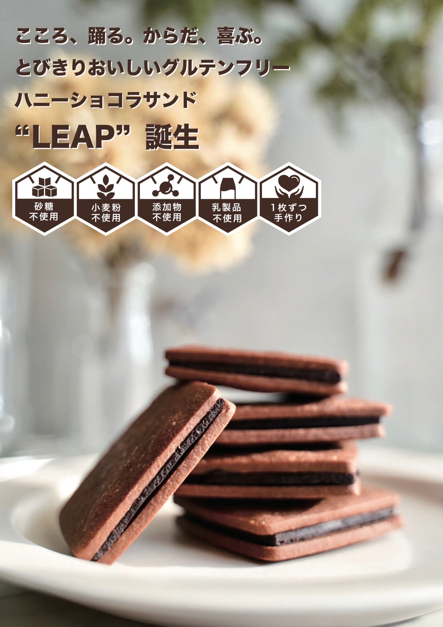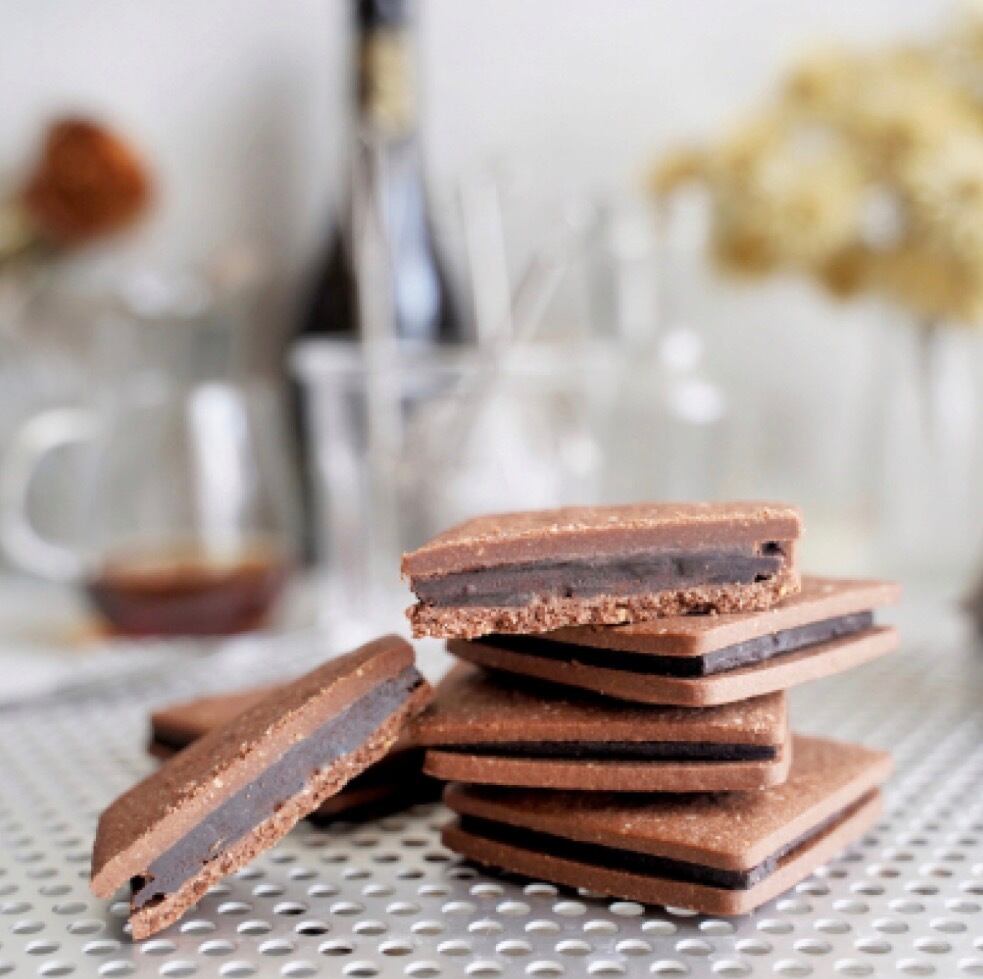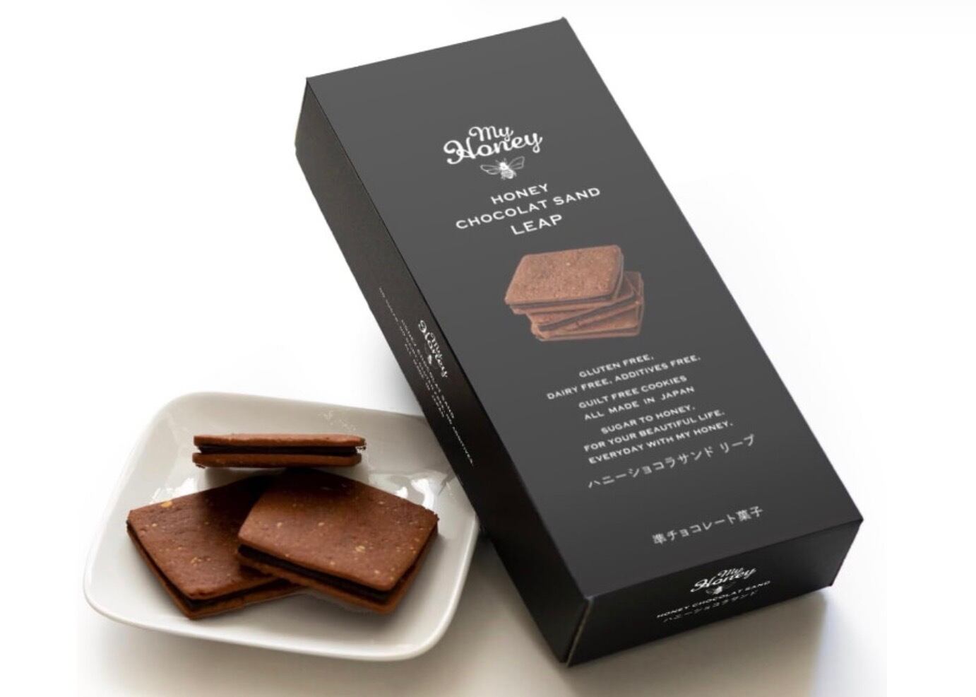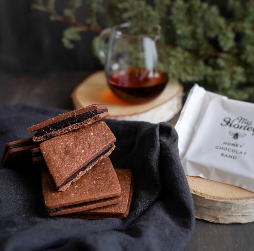 甘さは低GIの生はちみつだけ。1枚ずつ手作りで仕上げた罪悪感のないショコラサンドです。