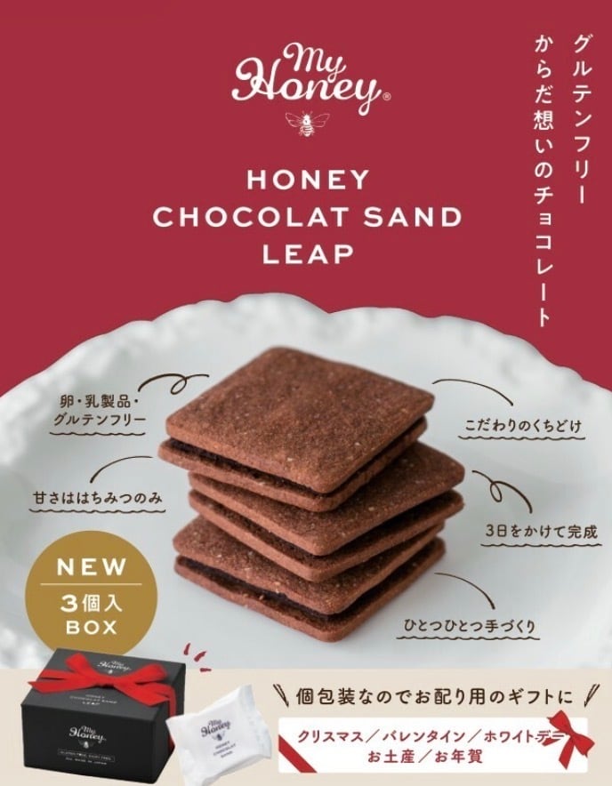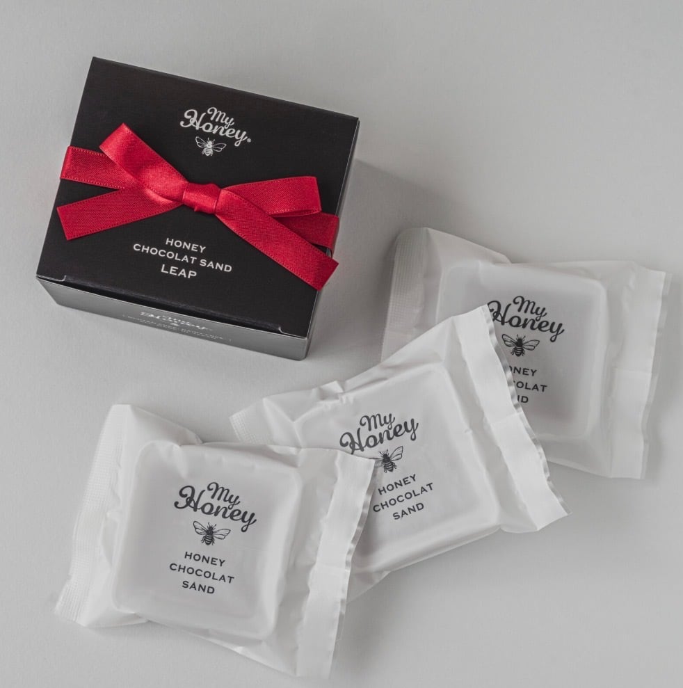 高級感がありつつも、ころんと可愛らしいカタチのハニーショコラサンドリープ3個入BOXができました。