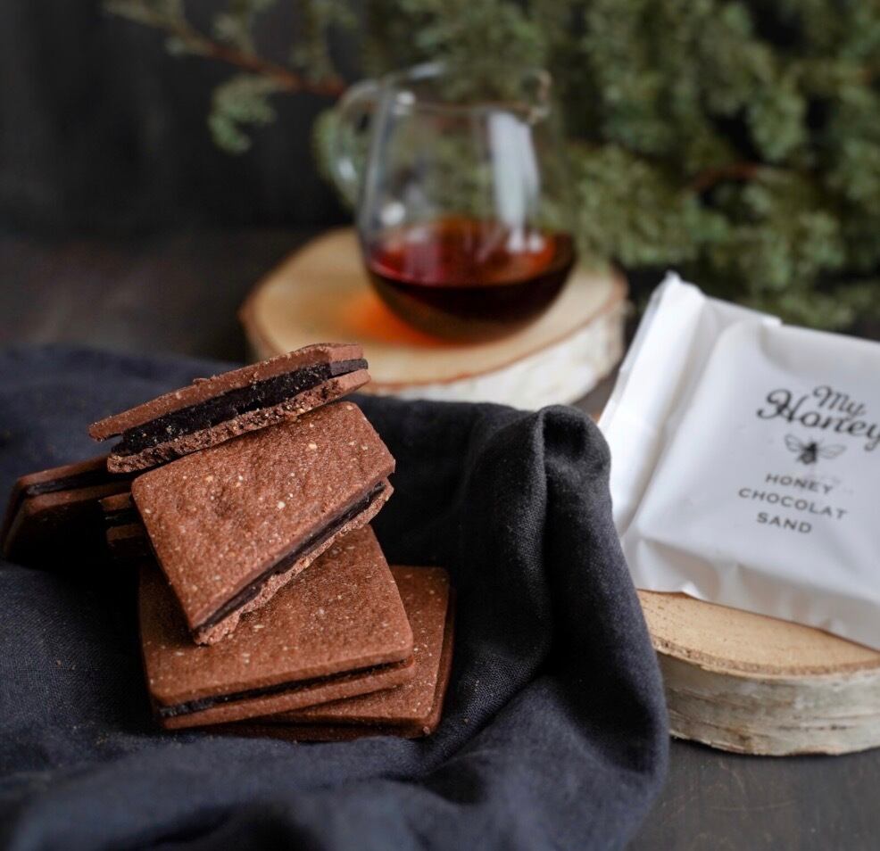 甘さは低GI(28)の生はちみつだけ。1枚ずつ手作りで仕上げた罪悪感のないショコラサンドです。