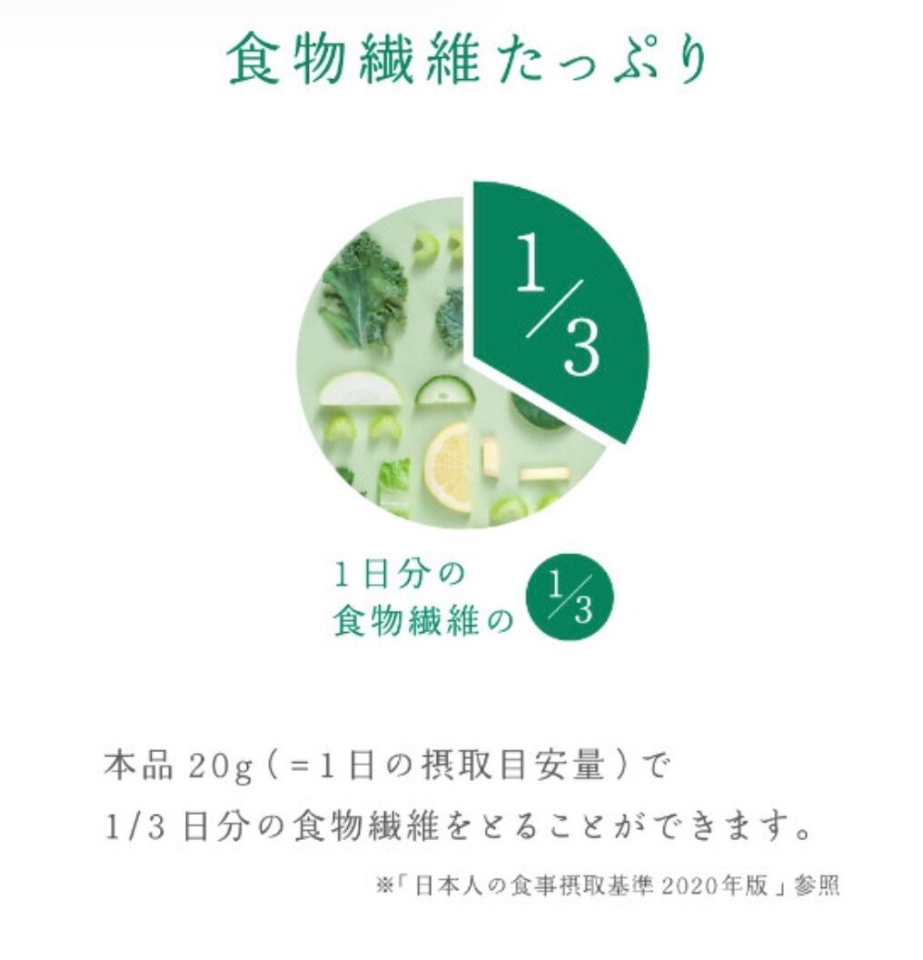 1⽇摂取⽬安量(20g)で約1/3⽇分の⾷物繊維がとれます。