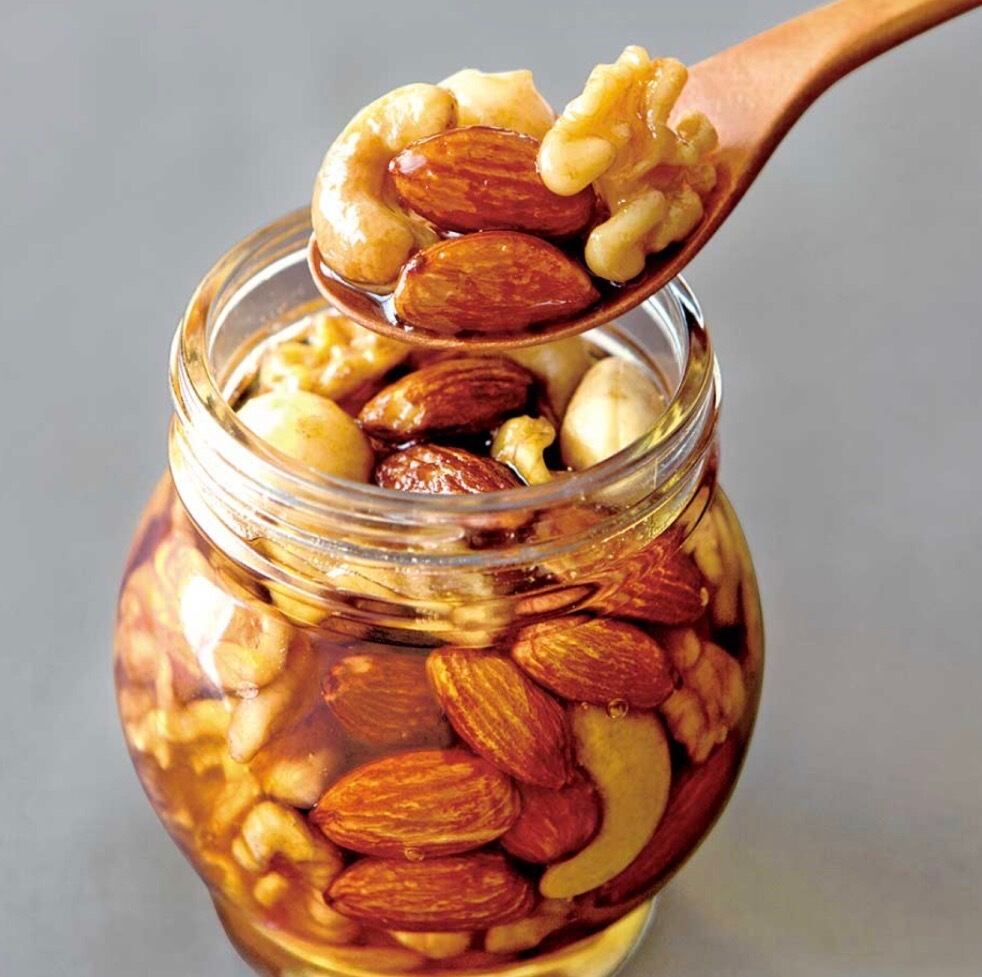 ナッツとはちみつの栄養が一度に摂れる「ナッツの蜂蜜漬け」。ミネラル豊富なナッツは気になる年齢、美容の面でも注目されており、今やヘルシーな食材として広く知られるようになりました。モデルの間食としても有名です。